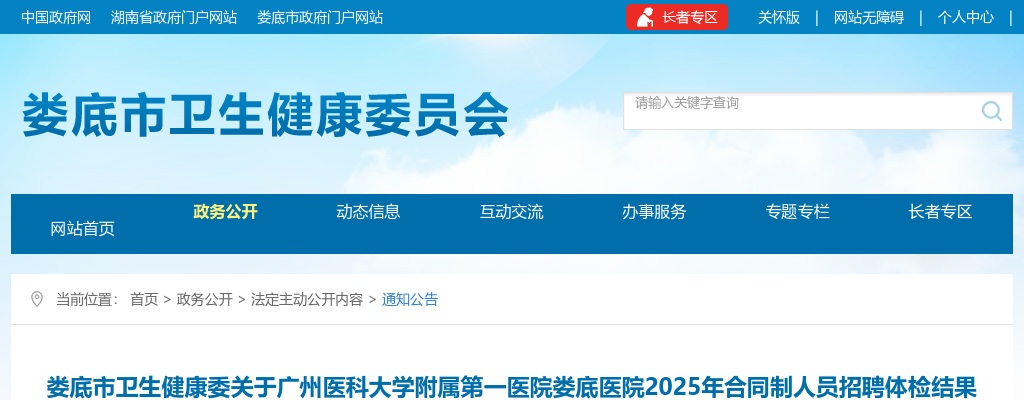 原标题:娄底市卫生健康委关于广州医科大学附属第一医院娄底医院2025年合同制人员招聘体检结果的公示